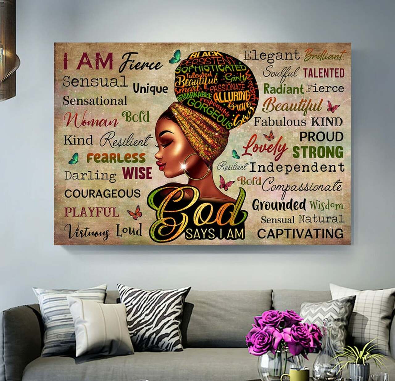 Black Queen God Says I Am Poster Print, Black Women Canvas Art, Afro Queen Wall Art, Afro Hair Clipart Wall Decor, Black Girl Magic | Wrap Canvas Ready To Hang