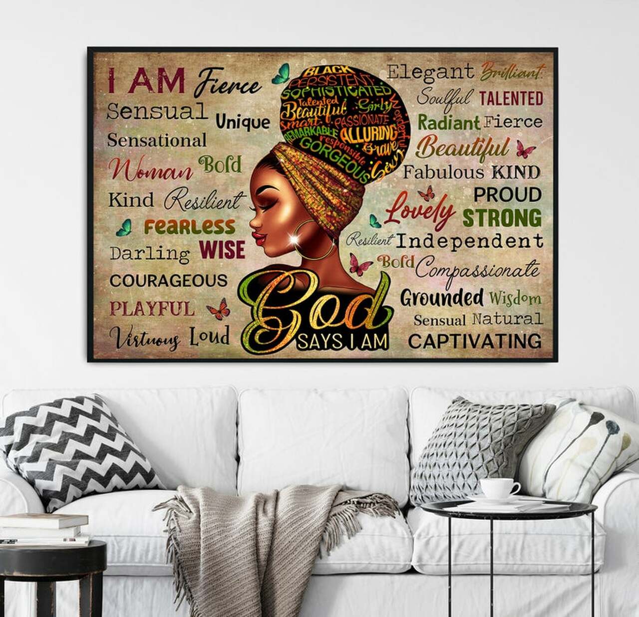 Black Queen God Says I Am Poster Print, Black Women Canvas Art, Afro Queen Wall Art, Afro Hair Wall Decor, Black Girl Magic | Unframed Paper Poster